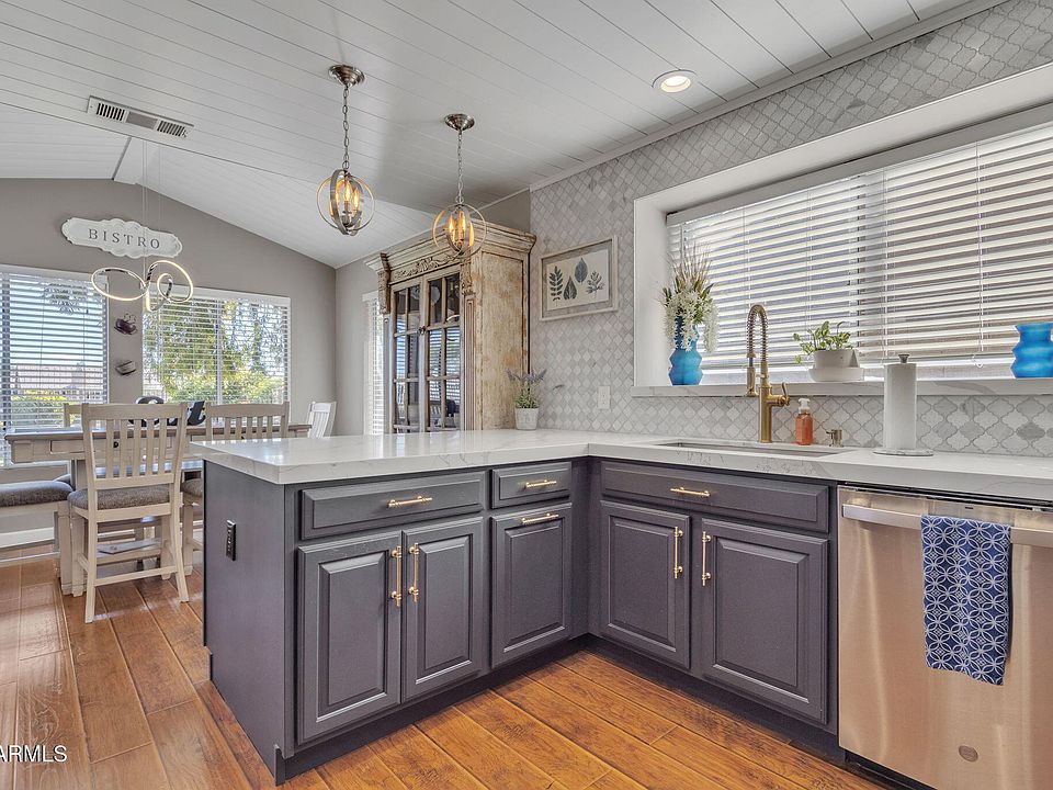 NE MESA LOCATION, COMPLETELY TURN KEY HOME ON GOLF COURSE! Updates galore on the 9th hole of Camelot Golf Course! Enter & find wood laminate throughout the main spaces plus a picturesque view from the living & dining rooms. Kitchen features quartz countertops, beautiful marble backsplash, stainless appliances, updated cabinets, breakfast bar & nook. Cozy up by the fireplace in the family room right off the kitchen. Both bathrooms have been fully updated with new flooring, vanities & tile surrounds. Head out back to find a private entertaining space with covered patio, grass area & golf course! Minutes away from the 202 that will take you west to shopping, ASU & airport. Scenic Red Mountain with hiking/biking trails just minutes away!