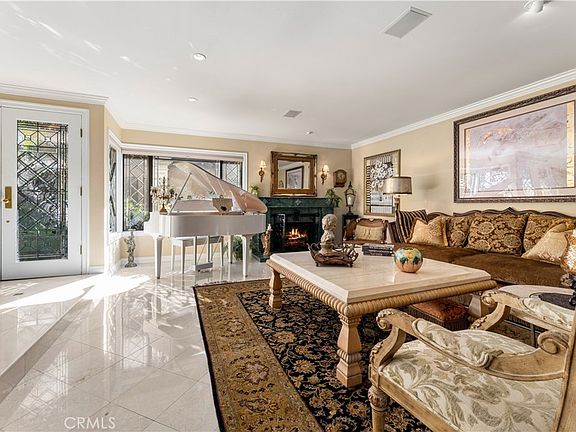 A unique feature of this home is the rare green marble carved fireplace and mantle in the living room, adding character and charm. Marble flooring in the entry and living room creates a seamless flow and a touch of sophistication. The double front doors are made of leaded and beveled glass, complimented by matching side and front windows. This adds a touch of elegance and natural light. Custom crown molding throughout exudes timeless appeal, enhancing the overall aesthetic.