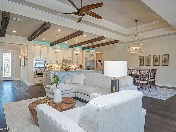 Located in the charming town of Ave Maria. This single family home offers the epitome of luxury and comfort, with every detail carefully crafted to create a truly exceptional living experience. As you step inside, you will be greeted by the stunning luxury plank flooring that flows seamlessly throughout. The beamed ceiling adds a touch of elegance, while the designer lighting and fans create a warm and inviting ambiance. The impact windows and doors not only provide security and peace of mind. Indulge in ultimate relaxation in your very own salt water stand alone spa. The whole house water system with reverse osmosis ensures that every drop of water you use is pure and refreshing. Membership is included to Panther Run Golf Course! With two master suites, this home offers the perfect blend of privacy and togetherness. The spacious lanai, complete with a tiki bar, provides ample space for hosting gatherings. Del Webb Naples is a vibrant 55+ active adult community, offering an array of amenities and activities to keep you engaged and fulfilled. From fitness centers and swimming pools to social clubs and events, there is always something exciting happening.