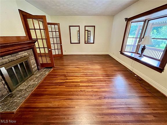 - Description: Oak floor, bay window, brick/ wood mantle, two sets of French doors.,Flooring: Wood