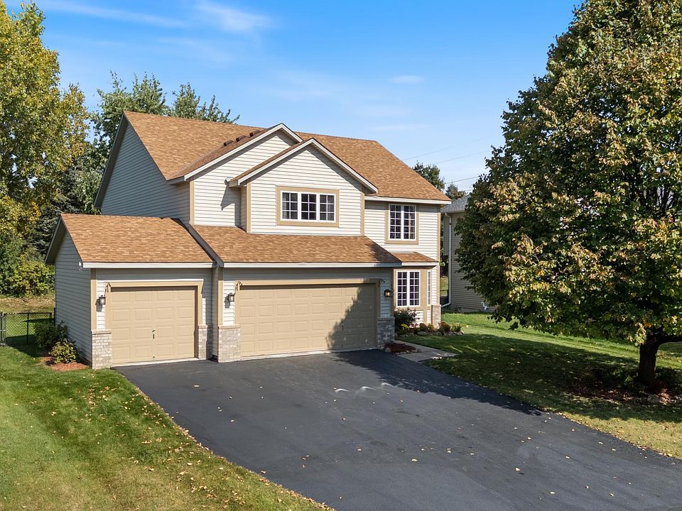 Gorgeous 5BR/4BA 2-story in highly sought-after Cottage Grove neighborhood! The main level boosts a huge custom kitchen with stainless steel appliances, an open 2-story living room with cozy gas fireplace, convenient half bath, and main-floor bedroom. The upper level features a stunning owner’ssuite with newly updated bathroom, two additional bedrooms, office, and full bath. Finished lower level includes a 5th bedroom, spacious rec room, ¾ bath, and large bonus room. Updates include newer A/C and furnace, plus a brand-new washer and dryer. Outside, enjoy the large fencedbackyard, oversized deck, and pergola—perfect for entertaining. The 3-stall garage offers plenty ofstorage plus a bonus room in the 3rd stall. A rare find combining space, updates, and an ideal location near schools, parks, and shopping.