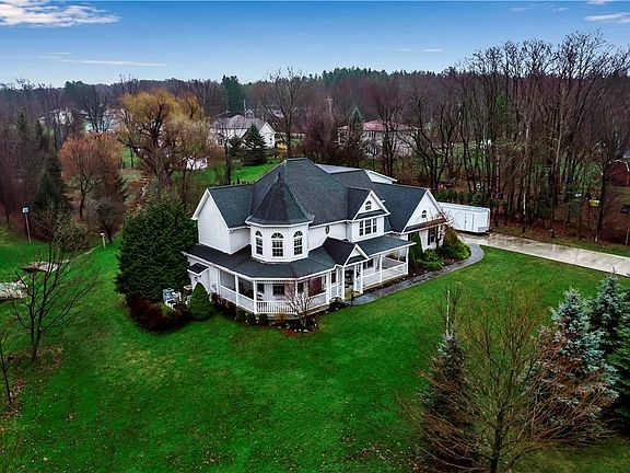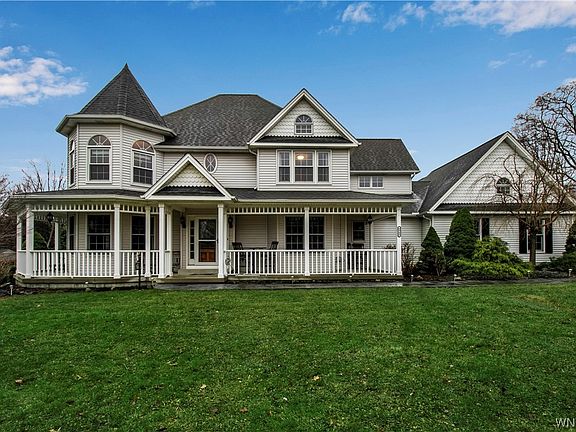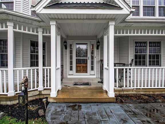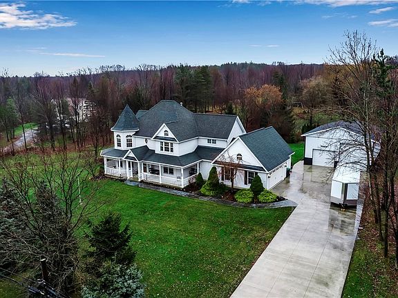 Magnificent Orchard Park Victorian-Style Alliance built home with new 14’ Pole Barn on 2+ Acres just steps away from Chestnut Ridge Park! This 2,886 sq. ft. home has gorgeous curb appeal w/a wraparound porch & center entry leading to a grand 2-story Foyer. The Foyer w/stately columns & gleaming hardwood floors leads to a formal living room w/leaded glass windows & dining rm. The Eat-In Cherry Kitchen features Corian countertops, stainless steel appliances, island w/breakfast bar w/sliding glass doors that lead to the backyard. The Family Rm. has large windows, glass cabinets & Gas Fireplace w/mantle. Other 1st Floor features incl. Double Staircases, Half Bath, Laundry & Mudroom. The 2nd Floor features 3 bedrooms, 2 full baths & 800 sq. ft. of Attic Space that may be refinished as a 4th bedroom. The Primary Ensuite, features a Tray Ceiling, Arched Windows, Walk-in Closet w/Built-ins, a Glamour Bath w/Whirlpool Tub, Shower & a Double Vanity. Outside enjoy the fully equipped Outdoor Kitchen (2020), Gunite Pool, Hot Tub, 30x36 Pole Barn (2020), 3.5 car attached garage w/Apollo floors, Generac Generator (2020) & New Concrete Driveway (2021).