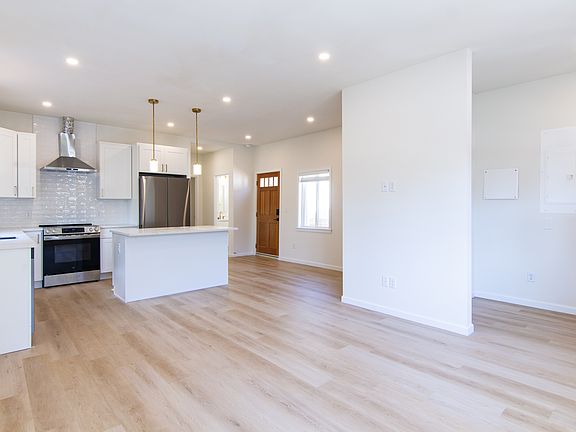 * Brand-New Kitchen: Modern white cabinetry, quartz countertops, range hood vent, large waterfall island, and stainless steel appliances
