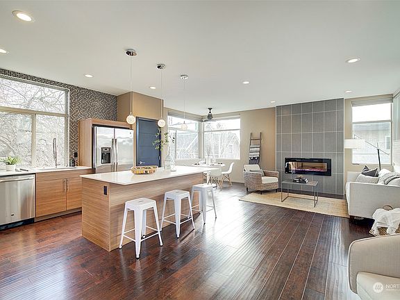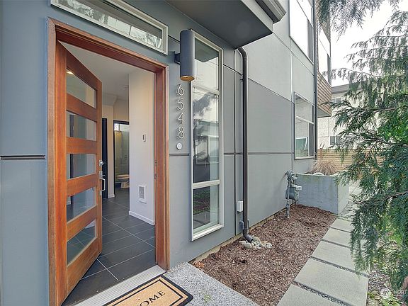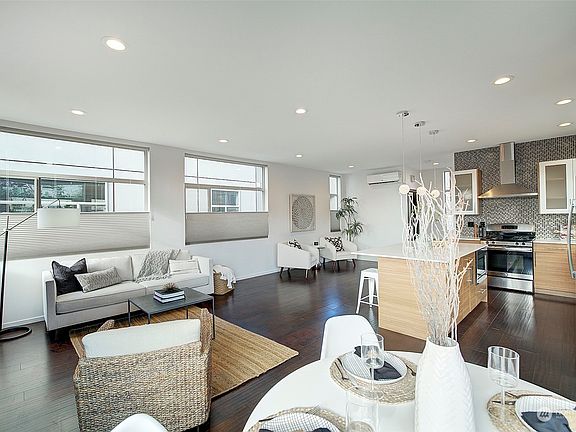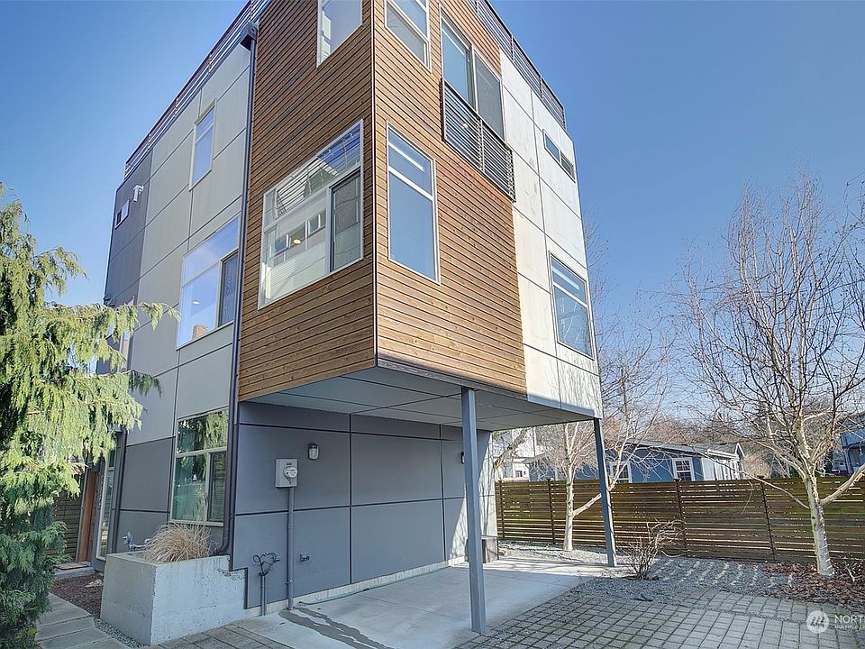 Exceptional great room concept w/south facing windows for outstanding light filled spaces. This standalone, 1900 sq. ft. townhome sits 3 lots in from 24th(very quiet), on it's own 1950 sq. ft. lot(no condo HOA!), w/two parking spaces, one covered. More importantly, this home lives like a true single-family home, with a luxurious, top floor primary suite twice as large as your typical townhome, w/sumptuous, 5-piece bath & large, custom crafted California walk-in closet. One flight of stairs up to your 500+ sq. ft. deck, a 270-degree view, from Phinney to downtown Seattle w/Rainier standing sentinel, to the Olympics! 2 bedrooms on the entry level (one w/stylish Murphy bed) & a 3/4 bath. Walk to Mabel's coffee, Olaf's & the Ballard Market!