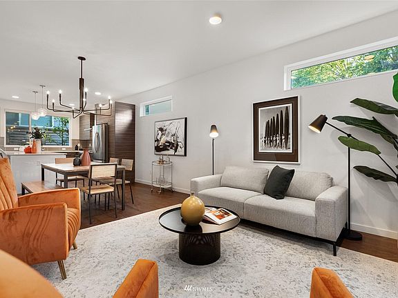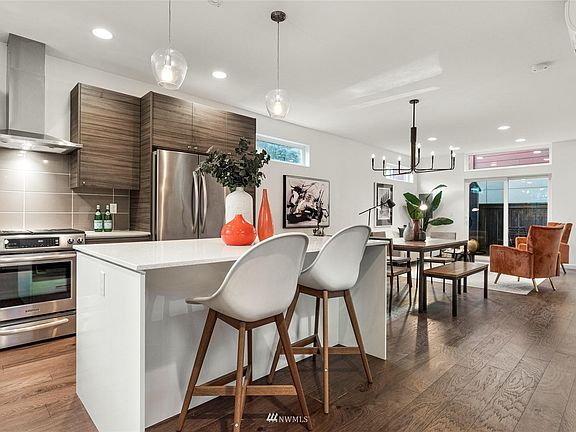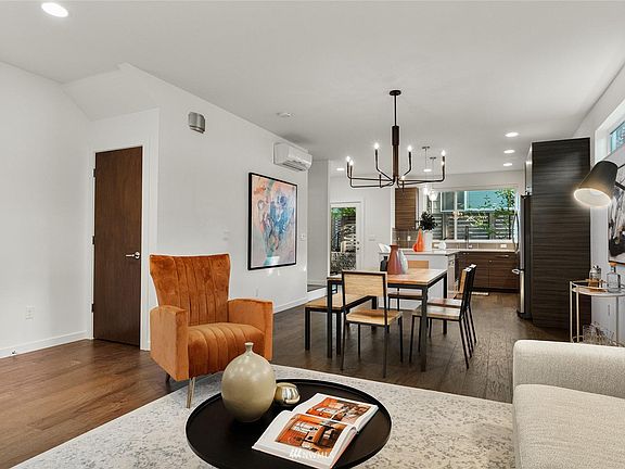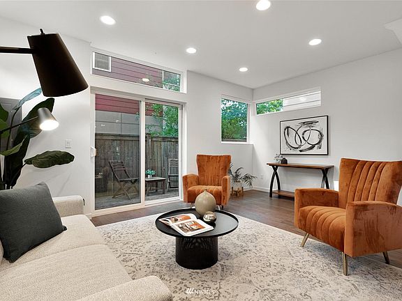 Modern stand-alone Four Star Built Green home with high-end finishes offers comfort and style. Light-filled open layout with nine foot ceilings is ideal for entertaining or quiet relaxation. Gourmet kitchen features energy-efficient appliances, quartz surfaces and custom European style cabinetry. Engineered hardwood floors throughout. 3 bedrooms include a large primary suite with vaulted ceilings, spacious custom closets, and ensuite upscale bathroom. Flex space on top floors is ideal for home offices. AC installed. The backyard space has a storage shed and grass patch, perfect for 4 legged friends. This West Seattle locale is an easy stroll to parks, dining, buses, shopping & schools.