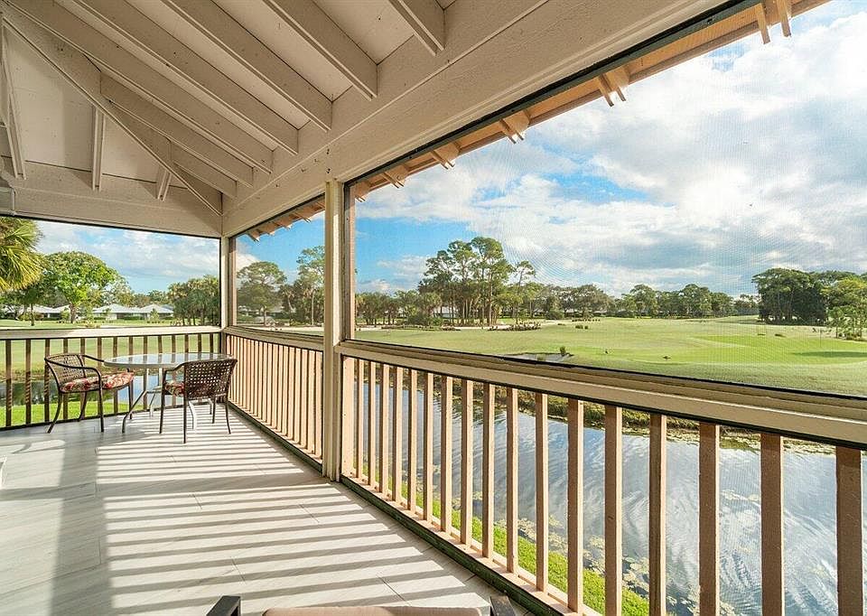 Enjoy the peaceful living in this bright, furnished, and tastefully renovated 2-bedroom, 2-bath condo on a private 2nd-floor walk-up. The open-concept kitchen boasts white quartz countertops and new recessed lighting that fills the space with a warm glow. Large windows throughout bathe every room in natural light, enhancing the clean, contemporary feel with modern design elements and no carpeting. The primary bedroom features a comfortable king-sized bed, while the guest room offers twin beds for a relaxing stay. Unwind on the spacious, wrap-around covered and screened balcony to take in panoramic views of the lush golf course and tranquil water. Savor community living with access to two inviting pools and a prime location just minutes from a variety of shopping and dining options.