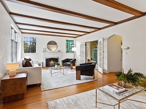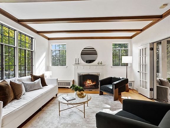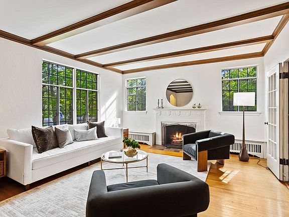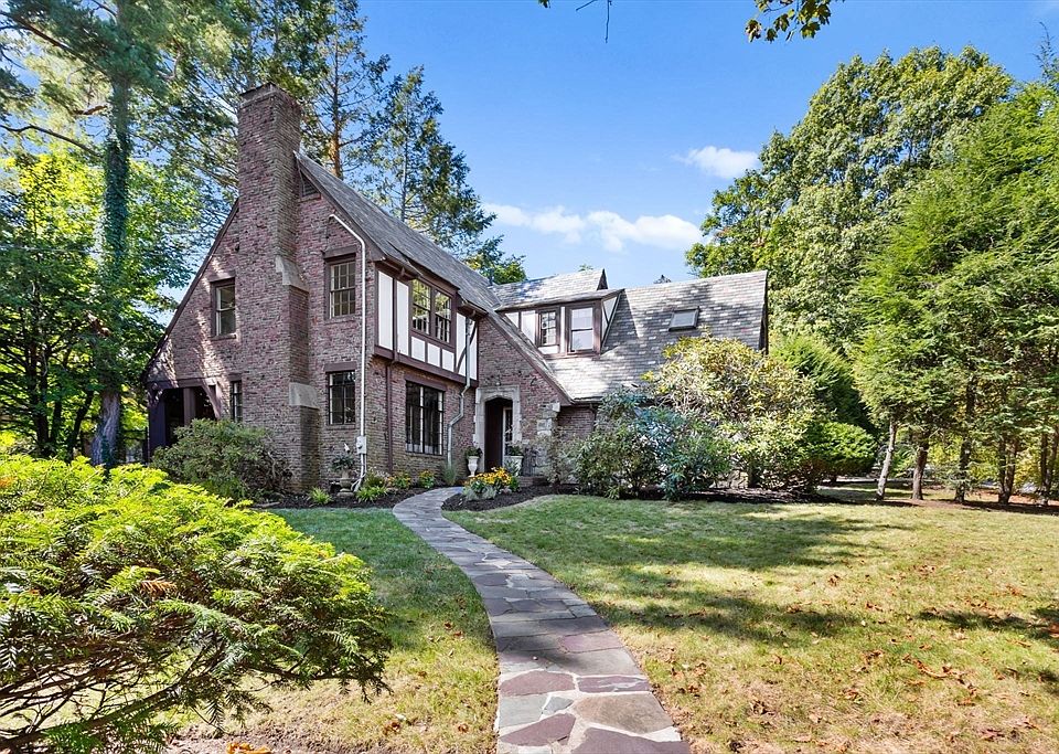 Gracious Tudor home in desired Newton location. Step-down fireplaced living room features high beamed ceilings, arched openings, oversized windows, hardwood floors and flows into an inviting sun room with floor to ceiling windows. Eat-in kitchen offers island, granite counters, bay window, plentiful cabinets and pantry. A spacious formal dining room with beamed ceiling completes this floor. Upstairs features a primary suite with private bath, 3 additional bedrooms, 2 full shared bathrooms and a bedroom/home office with separate entrance. Partially finished basement features a wood bar, play room/media room, laundry, storage and systems. 2 car garage plus parking for 4 more cars in the driveway. Driveway and garage access on Fairmont. Lush yard features a patio and is ideal for BBQ's and relaxation. Welcome home!