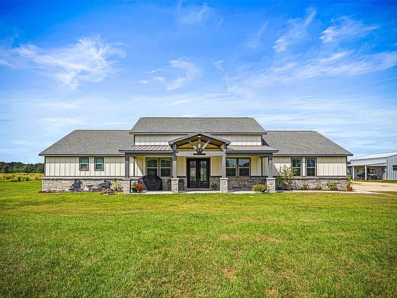 Beautiful modern farmhouse on acreage with gated entrance. This custom home features a stone and siding exterior, large front porch with wood ceiling detail, and an open floor plan filled with natural light. The spacious kitchen includes granite countertops, stainless appliances, and a large island overlooking the living room with vaulted ceiling and stone fireplace. Primary suite offers high vaulted ceilings, double vanities, walk-in shower, and plenty of storage. Property includes a shop/barn for equipment, projects, or livestock. Enjoy wide-open views, room to expand, and the perfect balance of comfort and country living.
