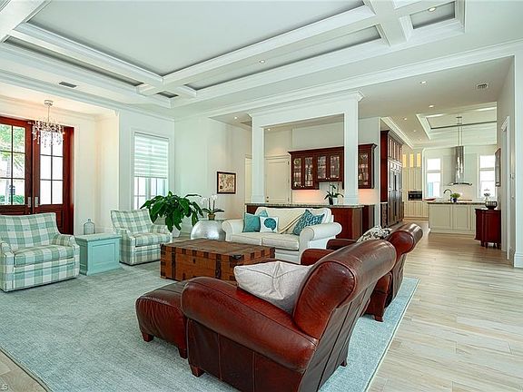 Idyllic residence nestled on beautiful tree lined Riviera Drive and just a short distance to the iconic 5th Avenue S. shopping/dining and the Beach. This newly built home features Coastal styled architecture and striking finishes that complement a design that is wonderfully well-suited to today's buyers. This ideal floorplan includes just under 5000 Sq. ft. under air, an open great room concept, with the Master + detached guest suite/ cabana / Covid home office on the first floor and 4 bedrooms on 2nd floor along with a second family room. The home is naturally bright, with pocket sliders for seamless indoor /outdoor entertaining and an outdoor space that will make you feel like you are on vacation everyday. The gourmet kitchen includes top-of-the line appliances, floor-to-ceiling cabinetry, and walk-in pantry with 2nd refrigerator. Perfectly suited for entertaining with fire bowl water feature pool accents, oversized pool and spa, gas fireplace, and summer kitchen with automatic screens on the lanai. Features also include solid concrete construction, high ceilings, and a centrally located bar. This home provides the ultimate in Naples living!