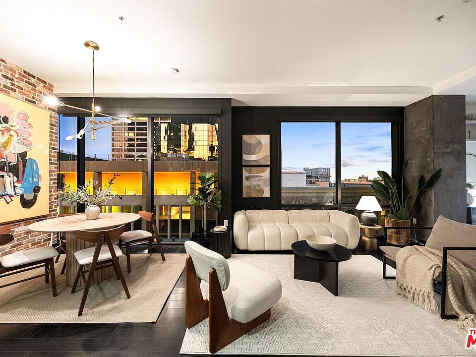 Nestled high on the 14th floor, the highly desirable end unit is a harmonious blend of modern elegance and urban sophistication. True urban dwelling with views of the bustling city down below. The open floor plan loft boasts floor-to-ceiling glass walls, tall gallery walls, 12-foot ceilings and warm dark hardwood floors. 2 unique brick accent walls and an East facing wall painted black. Natural light emanates throughout. The sleek kitchen features blue color cabinetry, white backsplash, granite countertops, stainless steel appliances and a new Bosch dishwasher. The bathroom features a soaking tub. Washer/dryer are included! Building amenities include 24/7 security/concierge, a rooftop sundeck, barbecue, a chic bar with panoramic downtown views, a resident club room, gym and a helicopter pad. 1 unassigned parking space included - in the building with a direct elevator bank to the 14th floor as well as the lobby.Located directly above the 7th Street Metro Station, enjoy the best of urban dwelling at your doorsteps. Walk to the action at Crypto.com Arena or LA Live. Enjoy the best of food and beverages at Javiers and Joyce. Across the street from the Bloc and Joeys. Whole foods is a stone's throw away and the Broad Museum is just a few blocks away. Enjoy rich and diverse dining, world class museums and tons of entertaiment options. Truly, the best location in Downtown L.A.