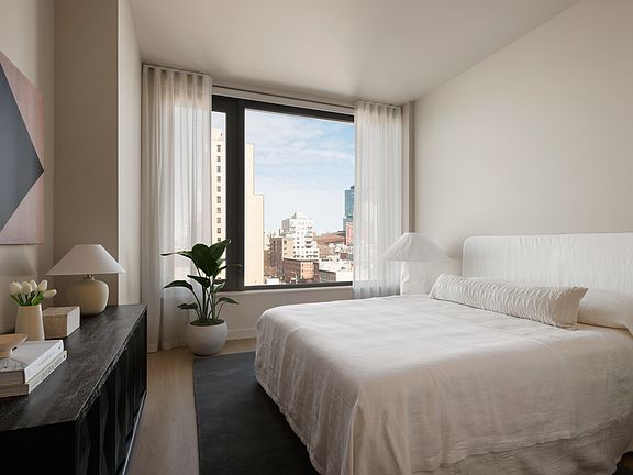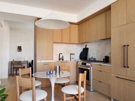 Each residence is thoughtfully crafted to maximize natural light, featuring refined finishes, smart layouts, and ample storage. The building offers one-, one-and-a-half-, and two-bedroom apartments, making it the perfect home for residents of all apartment sizes. Every apartment boasts white oak custom millwork, sleek panelized appliances, tundra grey marble countertops, Italian porcelain tiles, custom double vanities with generous storage, custom pendant lighting, and niche shower shelving. With soaring ceilings up to 11.5 feet, in-unit laundry, energy efficient central heating and cooling, and bespoke light fixtures, comfort is paramount. Double pane, bird-friendly windows and custom shades ensure peace and quiet amid the city's hustle and bustle. Many north- and west-facing units offer stunning skyline views, while others overlook Brooklyn's charming tree-lined streets towards Prospect Park in the horizon.