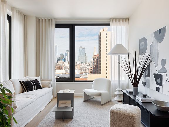 Each residence is thoughtfully crafted to maximize natural light, featuring refined finishes, smart layouts, and ample storage. The building offers one-, one-and-a-half-, and two-bedroom apartments, making it the perfect home for residents of all apartment sizes. Every apartment boasts white oak custom millwork, sleek panelized appliances, tundra grey marble countertops, Italian porcelain tiles, custom double vanities with generous storage, custom pendant lighting, and niche shower shelving. With soaring ceilings up to 11.5 feet, in-unit laundry, energy efficient central heating and cooling, and bespoke light fixtures, comfort is paramount. Double pane, bird-friendly windows and custom shades ensure peace and quiet amid the city's hustle and bustle. Many north- and west-facing units offer stunning skyline views, while others overlook Brooklyn's charming tree-lined streets towards Prospect Park in the horizon.