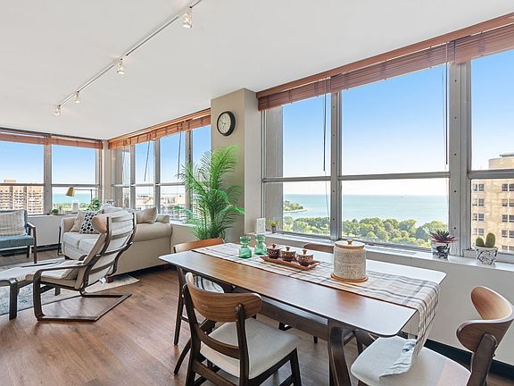 Open the door to sweeping views of Lake Michigan! This north and east exposure unit captures the magnificence of the lake, park, and harbor from every over-sized room. Living room is a stunner that will fit your largest parties. The kitchen features newer appliances and opens onto the ample dining area. King-sized primary bedroom looks to the lake with two walls of professionally organized closet space and en-suite bath. The second bedroom faces the lake with professionally organized closet space as well. A second family/guest bath, hall closets, and luxury vinyl in all the rooms completes the unit. Just steps from the lakefront. Enjoy amenities galore in this building. Pool, whirlpool, gym, basketball court, sundeck, grill/patio area, dog run, party room, and marketplace. Assessments include it all except electricity. Investor friendly with no rental cap. Building will be voting on upgrading elevators and plumbing risers in 2026. Management on site. Exceptional property.