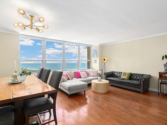 Discover your dream home in this exceptional oversized one-bedroom condo where every corner offers stunning views of the lake and an abundance of natural light. Meticulously maintained, featuring wood floors that flow through your main living area, stainless steel appliances in a kitchen with new Samsung Bespoke refrigerator that make cooking a delight! As a bonus, unit includes a large walk in closet off of entryway that could serve as a den, office area, or dressing room. The large open concept living room, dining room, and kitchen is perfect for entertaining and can comfortably fit a large dining table. The unit includes remote control blinds custom installed from 3 Day Blinds. This unit is also located on one of the Premium Tower Suite floors of the building and enjoys views of Montrose Harbor, the lake, park, and golf course. Conveniently located near Lake Shore Drive and the lakefront trail. Walking distance to Wrigleyville, Lakeview, L stations, and all of your favorite dining experiences. Enjoy the luxurious building amenities, including a sundeck complete with outdoor pool and grilling area - ideal for entertaining or simply relaxing and taking on the views. Stay fit in the fitness center or kick back in the on site theater room. Perfect for hosting with large sundeck area and newly renovated party room. Feel at ease with 24 hour door staff, swift maintenance team in building, and secure package room. Pet friendly building with on-site dog run. No rental cap makes this a perfect long term investment. Deeded indoor heated garage parking with assigned space is available for an additional $20,000!