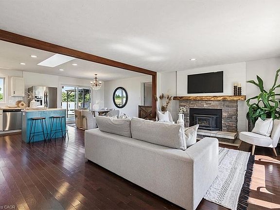 Set on just over an acre and backing onto tranquil farmland, this beautifully updated 4+1 bedroom, 4-bath bungalow offers the perfect blend of privacy, space, and convenience. Located in a sought-after pocket of Glanbrook, you're only minutes to Hamilton, Binbrook, and Ancaster—making commuting and city amenities easily accessible while enjoying the peace of country living. Step inside to a bright, open-concept main floor with hardwood throughout the kitchen, dining, living, and hallway. The kitchen is fully updated with block countertops, tile backsplash, breakfast bar, pot lights, and a skylight that floods the space with natural light. Sliding doors off the dining room open to a spacious rear yard—ideal for entertaining or quiet relaxation. The living room features a large bay window and a stunning wood-burning fireplace with stone surround and a newly redesigned custom live-edge mantel, while the oversized family room adds even more living space with crown moulding and another bright bay window. The primary bedroom includes a 3-piece ensuite and a newly added walk-in closet, with an updated main 4-piece bath nearby. A brand new powder room and refreshed front entry enhance the main floor's functionality and style. For added convenience, enjoy laundry on both the main and lower levels. A separate rear entrance leads to a fully self-contained in-law suite, thoughtfully renovated in 2016, featuring an open-concept kitchen and living area with pot lights throughout—ideal for extended family or rental potential. Additional upgrades include 200 AMP electrical service, new LED pot lights, new windows (2023), a 2024 heat pump and air conditioning system, and a complete water purification system with UV and charcoal filtration. This is a rare opportunity to enjoy rural charm with modern comforts, in a prime location just outside the city.