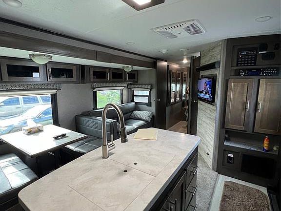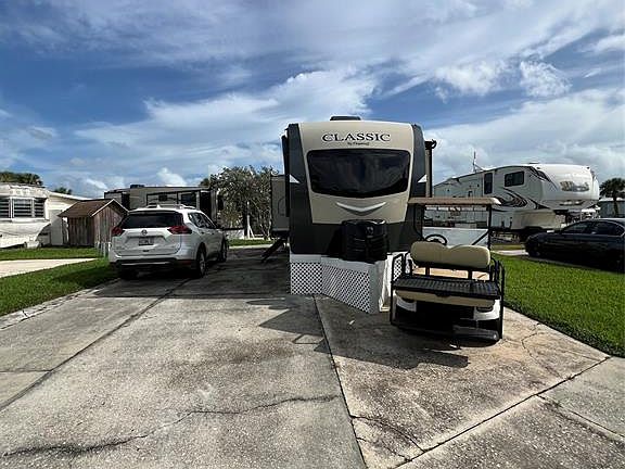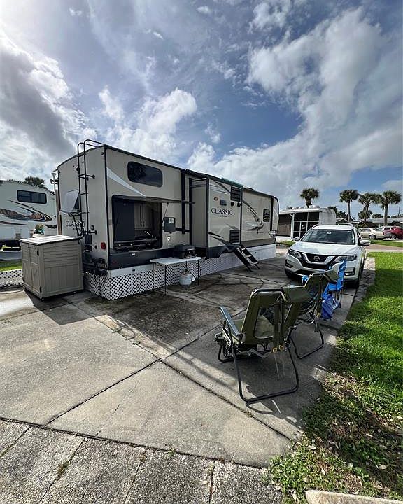~Ancient Oaks~ 55+ Community. 2019 Flagstaff "Forest River' 32' 2 BEDROOM 1 BATH. 4 slides/Outside kitchen. Queen beds/standup shower. Sleeps 6. Gas oven- 3 TV'S. Turn Key! All measurements are approximate.