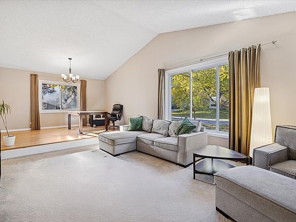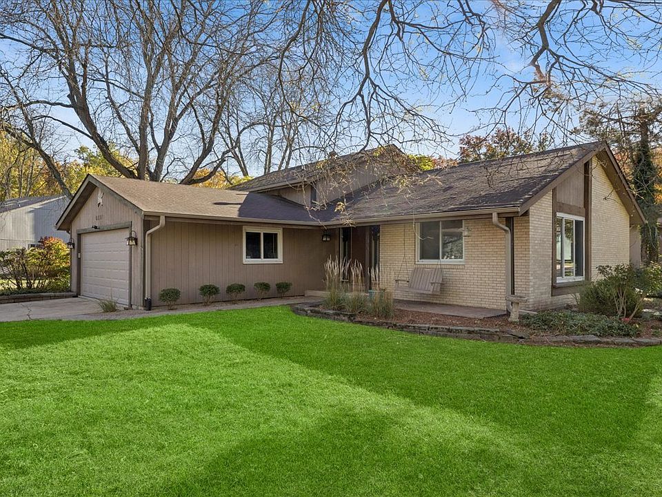 Charming and full of character, this corner-lot home sits on a quiet cul-de-sac in the desirable Green Trails subdivision-backing right up to the park and walking paths! A brick paver walkway leads to a welcoming front porch, perfect for morning coffee. Inside, the bright kitchen shines with 42" prairie-style cabinets, radiant-heat ceramic floors, Corian counters, and a breakfast nook filled with light. The dining room features hardwood floors and a chandelier, while the sun-filled living room has vaulted ceilings and a large picture window. The walkout lower level includes a cozy family room with a fireplace, an office (or optional 4th bedroom), laundry, and a half bath. Upstairs, all bedrooms are spacious and include ceiling fans. The primary suite offers a wall-to-wall frosted glass closet and a private bath with an updated vanity. Outside, enjoy a multi-level brick paver patio that opens directly to the park-ideal for relaxing or entertaining. Green Trails living at its best!