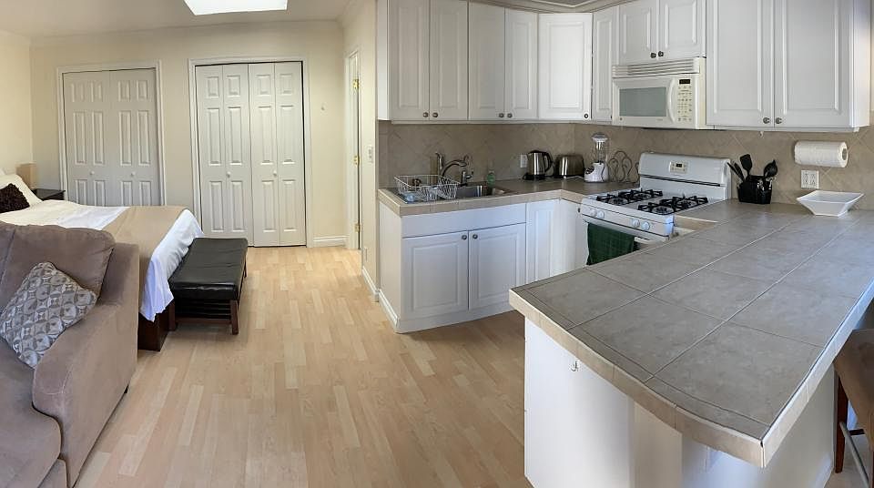 GUESTHOUSE/STUDIO - A very safe and quiet fully furnished bright studio guesthouse behind friendly family home in residential neighborhood. All utilities included in rental price: electric, gas, water, hot water, trash, WiFi, high speed internet, YouTube TV and gardener. The guesthouse has a full kitchen that is fully stocked with dishes, cutlery, pots, pans and more - and bathroom with bath and shower combined. The kitchen has stove, under-counter refrigerator and additional refrigerator in closet, plus microwave; also a study desk and chair, two closets, two skylights and two wall heaters. No shared walls. Street parking available. Grocery stores, restaurants and public transportation within walking distance. One mile walk to Loyola Marymount University, 2.5 miles to beach, 1.8 miles to LAX and Silicon Beach is a short bike ride away. We have a friendly old dog who is in the garden sometimes. Available for rent October 19th. Credit and background check fee to be paid by applicant One tenant only No smoking No pets