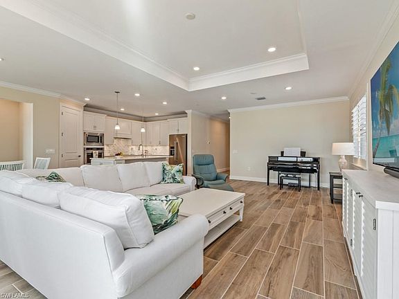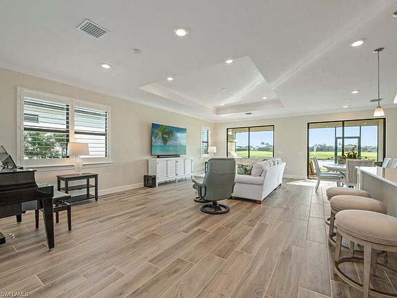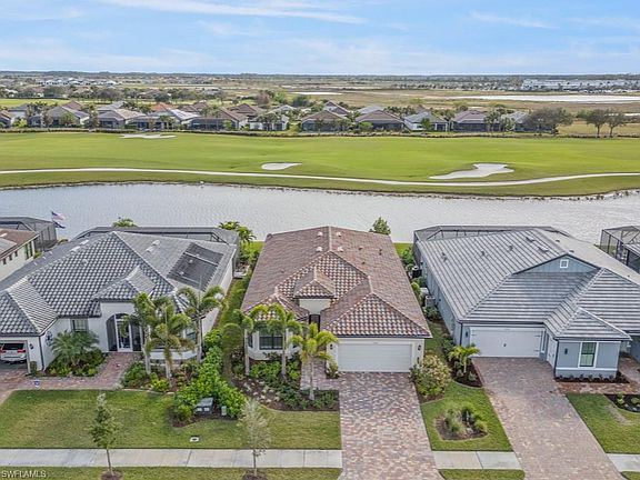 Discover your dream home in the vibrant town of Ave Maria! This stunning 3BR+Den/Flex Room, 2 BA residence, built in 2023, is the epitome of luxury and comfort and sits one of the last golf lots available in Del Webb. Step inside and be greeted by the beautiful open Mystique Floor Plan. As you explore the interior, you'll be captivated by the attention to detail, premium features, and abundant upgrades including beautiful plantation shutters and luxury porcelain plank flooring which flows throughout the home. Step outside onto the premium golf lot and enjoy the serene water view from your screened-in lanai with an outdoor kitchen, perfect for entertaining guests or simply relaxing in the Florida sunshine. The custom glass front door welcomes you into a bright and airy living space with open design and extra options throughout, making this home truly one-of-a-kind. The owners' suite is a true retreat w/spacious bathroom and walk-in closet. The laundry room is equipped w/cabinets, folding counter, and laundry tub. The 2-car arage offers upgraded epoxy flooring w/drop-down stairs for extra storage. Golf Course Membership comes with this home! Home is located within Del Webb community, where you'll find a wealth of amenities. Ave Maria has much to offer, from excellent shopping/dining options to university cultural/sports events. Naples' sandy beaches and shopping destinations are just under an hour’s drive away. Don't miss out on this rare opportunity to own a piece of paradise in this sought-after community.