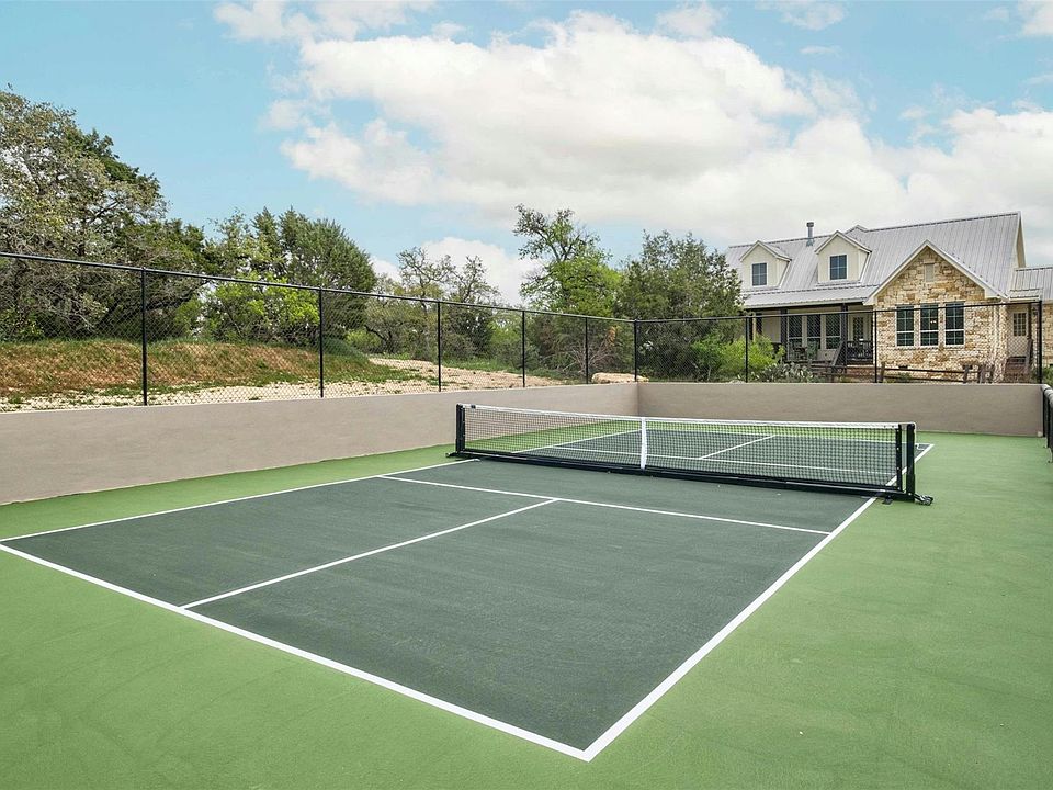 Pickleball Court at gated Twin Oak Estate, featuring 3 unique homes 7 miles from Wimberley Square, 8 miles from San Marcos Square. EV Charger for electric cars, new heated swimming pool, lush landscaping. Outdoor grill area, with bathroom, hot tub, private seating areas, fire pit. Ideal retreat or for a multi-generational family. See the attached floorplans to appreciate flexibility of spaces. Primary 2 storey home has 7 bedrooms 5 full baths, 1 half bath, plus sitting/gameroom/bedroom over 2 car garage currently with pool table, fabulous large screened porch. Approx 3000 sq ft. storage, 6' tall under Primary home. After hail storm, new roof on each home, larger roof over hot tub.