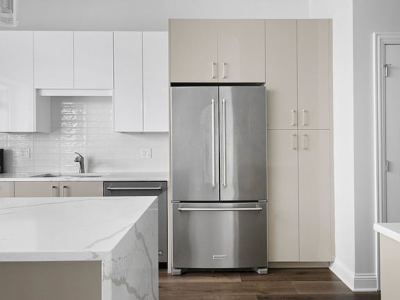 Modern designContemporary flat panel cabinetryGarbage chuteHeated garage parkingAdditional storage roomQuartz countersStainless appliances