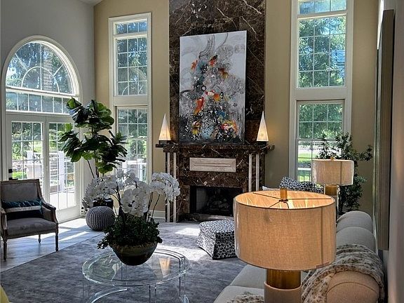 Beautiful 5-bedroom home, 4 Full and 2 half baths in the prestigious Canterbury on the Lakes! Recently remodeled throughout, and all seller projects are now complete!! The First-floor primary suite has vaulted ceilings, skylights, hardwood floors, a gas fireplace, a walk-in closet, and deck access. The gorgeous, remodeled kitchen boasts imported features, including solid surface countertops and center island, plus luxury brand appliances accented with custom lighting. Nearby beverage center and sizable laundry/utility room. You will love the open and airy flow throughout, an abundance of natural light, and accented by curved walls. Dramatic sunken two-story great room with skylights, floor-to-ceiling fireplace, and two access points to the deck. Also on the first level is a formal dining room and living room located off the two-story entryway, plus a half bathroom. On the second level are 4 additional bedrooms, one with a balcony and three full bathrooms. The open walkway in between rooms overlooks the great room and entryway. A newly finished rec room w/ a half bath adds to the living space. Enjoy your summer on a new maintenance-free deck that expands across the back of the house, overlooking a mature tree line, and includes an arbor. This home also features a 3-car garage and irrigation system.