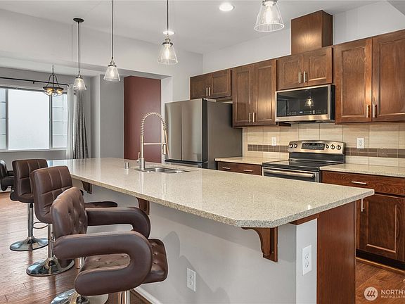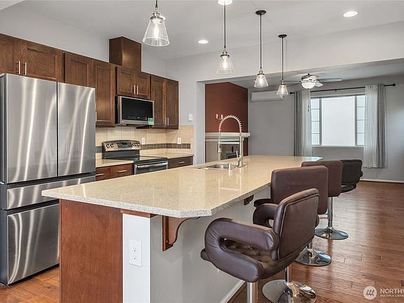 Pristine townhome on a great corner lot—this High Point Townhome has it all! This home boasts a large modern kitchen with an expansive granite countertop island. It features tasteful touches throughout, AC, a new fridge, new dishwasher, and new washer/dryer. The lower level includes a guest bedroom, while the main floor hosts the living area and kitchen, with two additional bedrooms upstairs, creating an ideal layout. This corner unit features a lovely fenced-in wrap-around yard with views of green space and easy access to community amenities. Your new home is conveniently located 20 minutes to Amazon, 20 minutes to the airport, 3 blocks to the Microsoft Bus station, shopping, dining, Home Depot, Costco and minutes from police department.