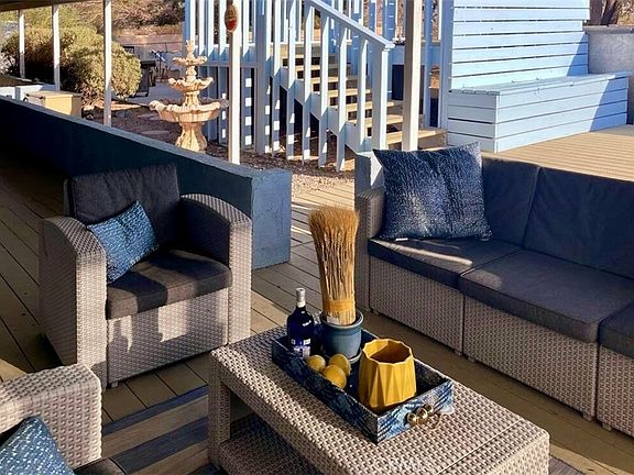 This 3-bed, 2-bath single-level home features 160 sq ft finished loft accessible from one bedroom. Upgrades: extra-thick walls for insulation, double-pane windows, new north roof, 34-panel 13.6 kW solar system, and Generac generator. Interior: new baths, kitchen, tile floors, paint, electrical by prominent designer. Family room has wood-burning fireplace with glass door and fan. Furniture available separately.