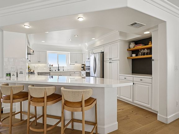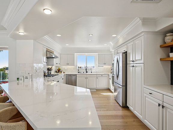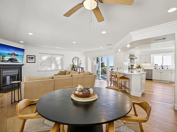The top floor serves as the heart of the home, where an open-concept layout connects the living room, a dining area, and recently remodeled kitchen. Stainless steel appliances, an oversized island with bar seating, and generous cabinetry create a space that's as functional as it is inviting. Sliding glass doors open to an ocean view patio ideal for dining and entertaining against the backdrop of Hermosa's golden sunsets. A second dining area, framed by windows and another set of patio doors, provides flexibility for both casual and formal gatherings.