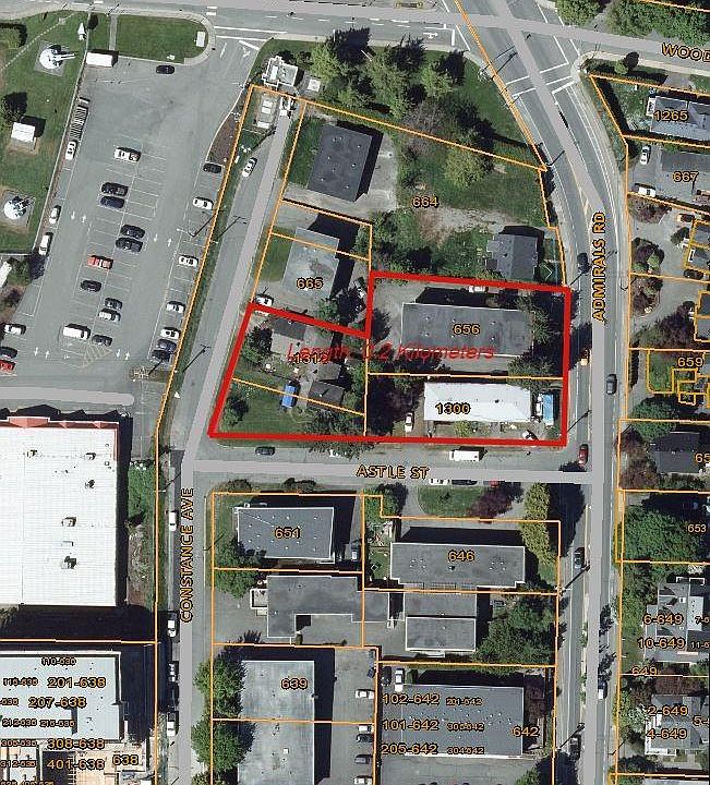 30,000 sq.ft. land assembly in Esquimalt core area designated "High Density Residential" in the 2018 Official Community Plan. The site comprises three legal lots with access from Admirals Road, Astle Street and Constance Avenue. The site is located at the doorstep of CFB Esquimalt (Naden) and a short walk to Esquimalt Town Centre. The site will offer ocean and mountain views from upper stories. Excellent access to arterial roads, transit and cycling infrastructure. 664 Admirals Road was recently rezoned by another property owner to permit a 12-story residential building. These three properties are being sold together for the published listing price: 656 Admirals Road - tenanted 13-suite residential apartment building; 1300 Astle Street - tenanted 5-suite residential building (non-conforming); 1312 Astle Street - tenanted 2-suite residential building.
