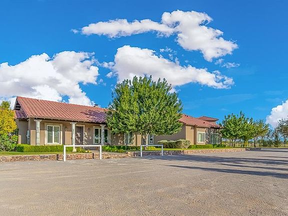 Beautiful 9.7 acre horse property with lovely Estate home designed by Chad North plus 3 BR 1487 sqft guest house. Additional 400 sqft living quarters on property plus 8 stall horse barn, hay barn, tack room, riding arena, pastures, and alfalfa field. Single story home with 12 foot ceilings throughout. Formal LR with FP & formal DR with built-in buffet. Large den with FP comprises three seating areas, built-in entertainment center with bar, & room enough for pool table. Gourmet kitchen with two islands, beautiful cabinetry, stainless appliance package, ice-maker, wine fridge, & barstool seating. Large master suite with double walk-in closets & master bath area with double sinks & whirlpool tub. Exercise room & Office/study also off of master suite. Opposite side of home has 4 guest BR , each with their own bath area. (Amenities: 4 car garage, outdoor kitchen & sitting area, gated property, granite tops, custom drapes, French doors throughout, crown molding & security system.)