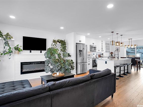 This trendy two-storey isn’t just a house, it’s a lifestyle upgrade. 1,488 square feet of pure “Pinterest-worthy” living space with 3 beds, 3 baths, and design details that leave boring builder-basic homes in the dust. The main floor is built for both function and flex. Engineered hardwood floors set the tone while a massive island anchors the kitchen for brunch spreads, coffee chats, or late-night takeout. Stone countertops, a sleek tile backsplash and a living room with a cozy electric fireplace turn every day into an Instagram story. The oversized custom pantry and mudroom bench are storage solutions you didn’t know you needed until now. Head upstairs and things get even better. Vaulted ceilings make the space feel bright and airy, the primary suite adds a touch of drama with a feature wall, plus the ensuite feels more spa than bathroom with dual sinks and a shower system that instantly upgrades your mornings. With two more bedrooms plus the ultimate convenience of upstairs laundry and you’ll wonder how you ever lived without it. Out back, the large deck calls for BBQ nights and summer hangs. Air conditioning keeps things cool inside, and the separate side entrance opens the door for all kinds of flexible basement development. This neighbourhood blends modern living with natural beauty. You’re minutes from the Northeast Swale conservation area and trails, so sunset walks, biking, and morning runs are right outside your door. At the same time, you’ve got quick access to shopping, as well all the restaurants and amenities in University Heights and Brighton. Aspen Ridge is one of Saskatoon’s fastest-growing communities, with stylish new homes, beautiful green spaces, and great neighbours. Trendy, functional, and full of personality, this house doesn’t just check the boxes, it raises the bar.