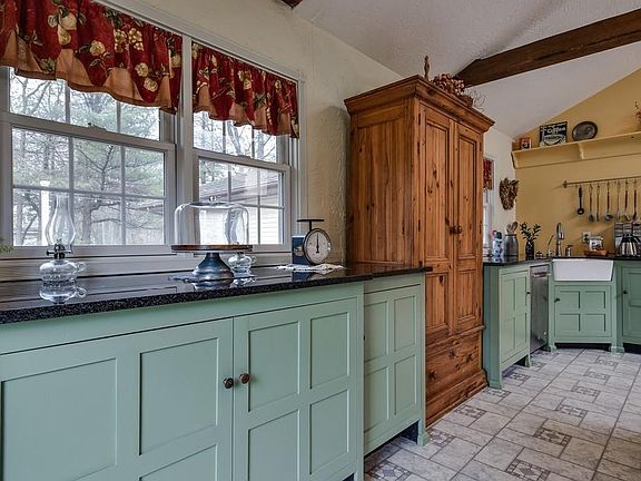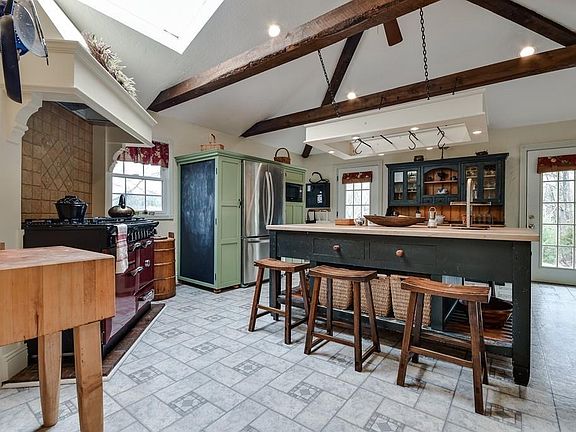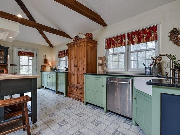 - Kit Dscrp: Flooring - Vinyl, Pantry, Main Level, Ceiling Fan(s), Countertops - Stone/Granite/Solid, Deck - Exterior, Skylight, Closet/Cabinets - Custom Built, Kitchen Island, Stainless Steel Appliances, Recessed Lighting, Ceiling - Beamed, Remodeled, Window(s) - Bay/Bow/Box, Country Kitchen, Gas Stove