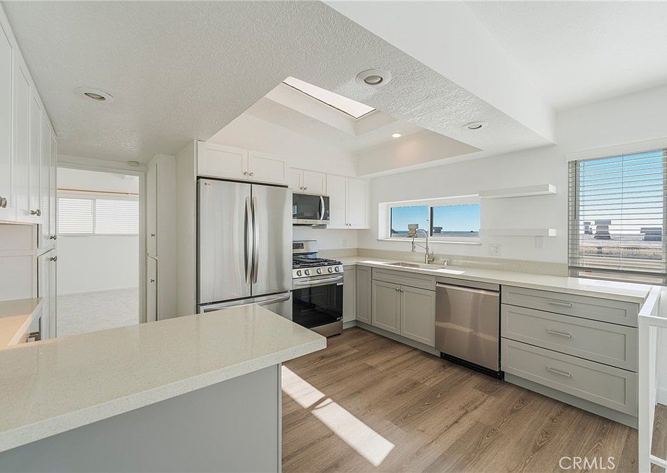 Two, oversized en suite bedrooms make this one the most unique and desirable homes for lease in the downtown area. Available for the first time since a major remodel of the kitchen, both bathrooms and the addition of a dedicated laundry room, this home has the style, status and location to fully enjoy the Manhattan Beach lifestyle. The new kitchen features all new stainless steel appliances including a five-burner gas stove with a griddle, a double door refrigerator with a freezer drawer, a new sink and faucet wand sprayer, functional quartz counter tops and roomy cabinets, cupboards and drawers. The bathroom remodels include new toilets, sink basins and vanities. The spacious 5' x 9' laundry room includes a new, full size washer and dryer by Inverter Direct Drive. A new sectional garage door maximizes usable space in the two-car garage. Each bedroom is large (12' x 18') (18' x 15') and can easily accommodate a king bed with ample room for an office or setting area. Both bedrooms have abundant closet space. The home has good window coverage providing loads of natural light and views of the Palos Verdes Peninsula and Catalina Island.