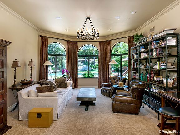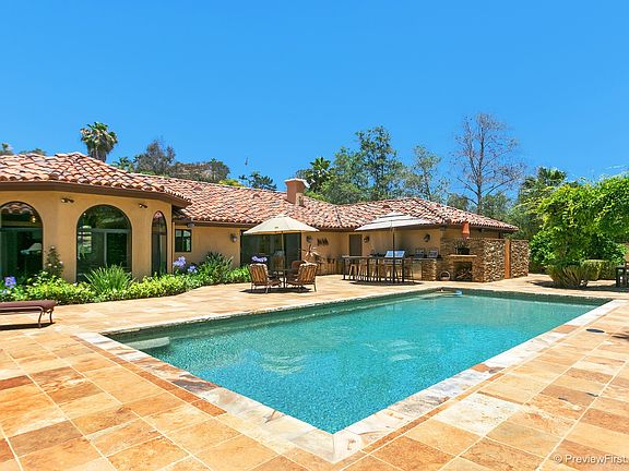 Fantastic 1 story custom home in exclusive gated Quails Ranch! Featuring exposed wood beamed ceilings, exquisite lighting, chef's kitchen w/Bertazzoni stove, oversized refrigerator, veg sink, granite & skylight, breakfast nook & formal dining, paver tiles, full bar w/168 bottle wine fridge, master w/beautiful fireplace, built-in dressers & 2 walk-in closets. Resortlike backyard w/pool, BBQ w/2 burners, granite bar, sink, fridge, pizza oven, firepit, patios, putting greens, raised gardens & more! See Supp.