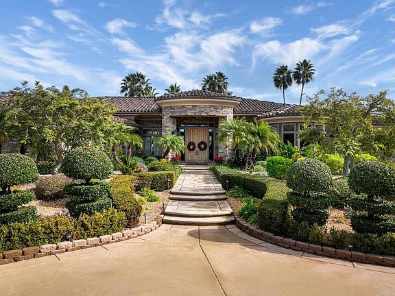 Location, style, attention to detail and masterful construction find harmony within this Mediterranean style Rancho Santa Fe estate. Ideally situated, on 2.4 beautiful private, gated and fenced acres, this custom single-story residence uses timeless design elements and materials. The gracious home exudes casual elegance and provides the ultimate venue for indoor/outdoor living and entertaining. Enjoy stunning mountain and back country views with filtered sunlight throughout the residence. The approximately 7,000 square foot residence encompasses five well-appointed bedrooms suites, stylish powder room, formal living and dining rooms with large windows, wood flanked office with marble fireplace and storage and a wonderful heated outdoor living room. The family room with custom cabinetry, stone ledger fireplace and full-service bar opens to the kitchen - designed for a chef with informal dining and is finished with top-of-the line appliances and stone countertops. The sublime primary suite includes large sitting area, Zen-like spa bath, oversized dressing room with custom built-ins and an inviting fireplace. Upscale designer finishes throughout include furniture-grade cabinetry, custom tile, hardware and fixtures, granite slabs, hardwood floors, substantial stone fireplaces, French doors and oversized windows and abundant storage. Enjoy the outdoors with a sun splashed pool with water fall feature and spa, outdoor heated living room, summer kitchen with bar seating, fruit trees and lush landscape---the perfect venue for grand scale entertaining, family gatherings or relaxation. 4 car garage. All gated and fenced. Hardwood and travertine floors. Whole house solar. Close to shopping, major highways and some of the best beaches in Southern California.