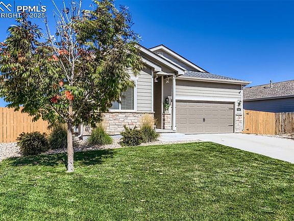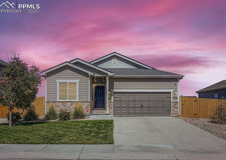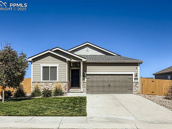 Welcome to this beautifully maintained ranch-style home in the desirable Lorson Ranch neighborhood, offering main level living and Colorado charm. This thoughtfully designed three bedroom, two bath residence features a spacious great room and large dining area—ideal for everyday living and entertaining alike. The kitchen is the heart of the home, showcasing an oversized island, gas cook top, walk-in pantry, and abundant counter space. The expansive laundry room includes a washer and dryer with plenty of storage to keep things organized. The primary room is a peaceful retreat with an oversized tub/shower and large walk-in closet. Step outside to a lovely backyard deck with mountain views, the perfect backdrop for morning coffee or evening gatherings. The landscaped, and fenced yard includes sod with sprinklers, and a mature tree and shrubs. Multiple upgrades to this home include stone-accented siding, a new roof, a new garage door, GE stainless fridge and new disposal, window coverings, regularly serviced mechanical systems, air conditioning, and ceiling fans for year-round comfort. Stylish extended wood laminate flooring flows throughout much of the main level, complementing the home’s open, airy feel. With close proximity to military bases, new schools, parks, and shopping centers, this home blends modern layout with everyday convenience.