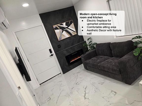 Electric fireplaceModern setupOpen-concept spaceAesthetic decorSound system