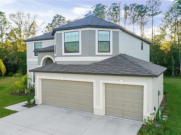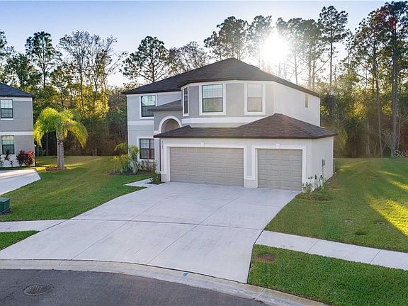 One or more photo(s) has been virtually staged. Location is incredible! Ready to move in immediately to this beautiful huge 5/3/3 LENNAR home? Looking for your quiet paradise? This magnificent Cul-de-Sac home is on over 1/4 acre of conservationist lot. The "Wolcott" is a very desirable two-story floor plan, offering 5 bedrooms, Den, Family room, Living room, Dining room, Dinette, Loft area, 3 full baths and 3-car garage. Spacious great room is open to kitchen offering large center island and dining room which makes this home perfect for everyday living or formal entertaining. The Chef's kitchen has an abundance of counter space, cabinets, eating space in kitchen, recessed lighting, double pantries, and is open to family room for entertaining. Home is designed with high ceilings, beautiful lighting fixtures, open concept for entertaining and dining. Large Master suite 19x19 with double walk-in closets, large master bath with garden tub, double vanity, and walk in shower. Upstairs offers three additional bedrooms all with ceiling fans and crown molding. Don't forget about the upstairs Loft 12x11 area for a family gathering point or den and full bath #3. Washer/Dryer are conveniently located on the second floor. This home has screen rear lanai off kitchen area, 3 car garage with remotes, irrigation system, and dual control A/C centralized system. Come see what this home has to offer and check out the community which has pool, playground, and much more! Silverado Ranch is incredible. Call today to book your showing before this one is gone!