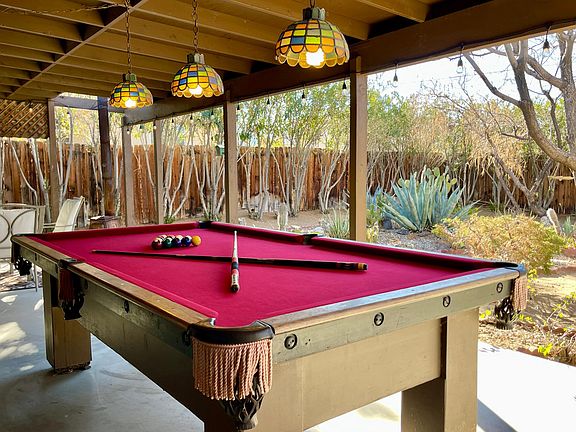 The Pine Spring rental house is a fully furnished three-bedroom, two-bath home with a two-car garage and a spacious interior. Situated in a premier neighborhood of 29 Palms, this split-floorplan home is tastefully decorated and arranged with comfortable furnishings and everything needed to call it home.