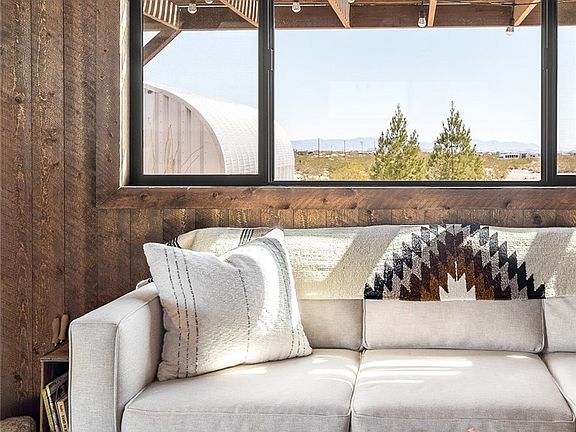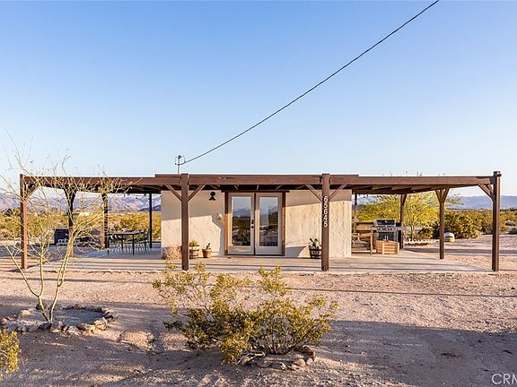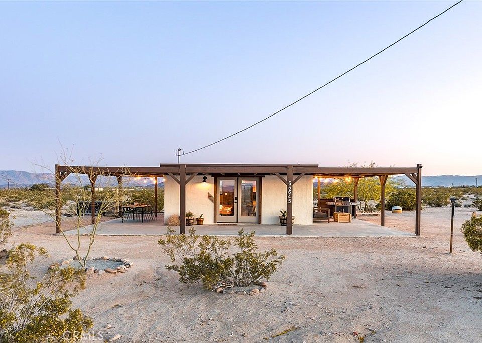 Welcome to Blue Shadows, a bespoke 1957 homesteader cabin turned fully permitted single family home & quonset hut on 5 scenic acres in Joshua Tree. Why spend weekends battling crowds and traffic when you could be unwinding by the fire pit under a canopy of stars with sweeping views of Joshua Tree National Park as your backdrop? Don’t let the compact footprint fool you, this turnkey home packs a punch with custom finishes throughout, including polished concrete floors, Energy Star certified Milgard windows and French doors with black-out shades, custom woodwork and cabinetry, and a newer mini split for year-round ultra-efficient climate control. Surrounded by 734 square feet of shaded patio, you’ll be inspired to spend more quality time outside taking in the sunrise, reading a book, sneaking in a quick nap, basking in the desert air after a rain, or catching up with friends over sunset beverages. Once the sky has flooded with stars head over to the new 6-person spa for constellation mapping, deep conversations, or just a peaceful moment of jetted hot tub zen. A 750 sq ft Quonset Hut built in 2021 makes the perfect accessory flex space to use as a studio, workshop, or garage - or convert it to a legal guest house/ADU for 1,238 sq ft of living space. Remote enough to genuinely feel like you’ve escaped the chaos of the world, yet you’re still connected with city water, SCE power, high speed internet, leased propane, and weekly trash service. Lovingly adored as a special weekend getaway and successful short term rental, this low-maintenance turnkey escape could be the perfect little dose of magic your life needs.