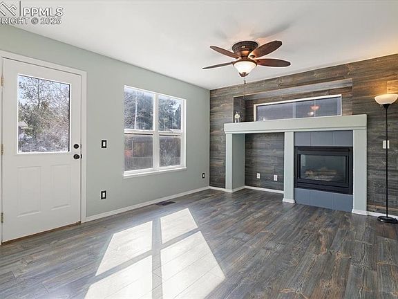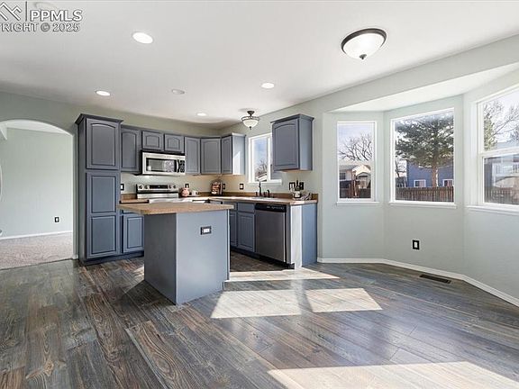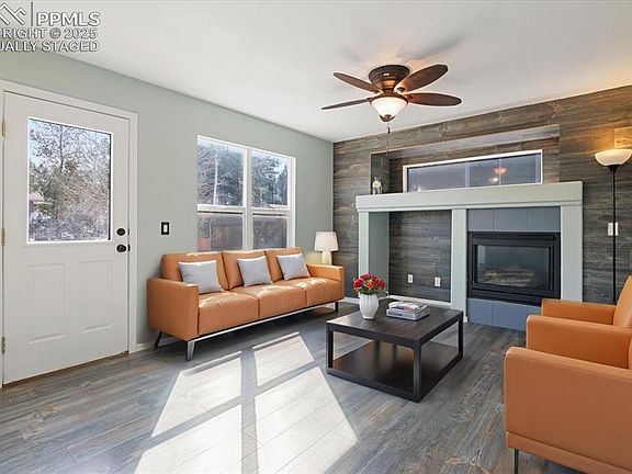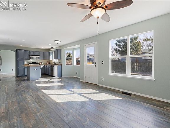 Welcome to this fantastic move-in ready, with Great Rocky Mountain & Pikes Peak views from the front!! This home exudes pride of ownership throughout. The open and welcoming living room features a bay window that fills the space with natural light. The formal dining area is conveniently located near both the kitchen and living room. The spacious kitchen boasts gorgeous maple cabinets with crown molding, matching stainless steel appliances, recessed lighting, ample counter space, and an island with a counter bar. The kitchen also includes a cozy eat-in area with a bay window. The main level walk-out family room, complete with a gas fireplace, offers another great space for relaxation or entertaining. A convenient laundry room and half bath complete the main level. Upstairs, you'll find a roomy main bedroom suite with vaulted ceilings, a walk-in closet, and a private adjoining 5-piece bath with a large soaking tub. The upper level also features three additional large bedrooms and a full bath. The fully finished garden level basement features a secondary family room with surround sound and recessed lighting, two additional bedrooms, and a full bath. Additional features of this home include ceiling fans throughout, upgraded light fixtures, 6-panel doors, and more. The privately fenced backyard boasts impressive landscaping, including low-maintenance and water-conserving artificial turf and fire pit. A 22x15 patio provides the perfect space for outdoor relaxation, and the front of the home offers great Rocky Mountain & Pikes Peak views. Conveniently located near schools, parks, shopping, and a great location if you need to commute to Schriever SFB, Peterson Space Force Base, and Colorado Springs. You don't want to miss this spectacular home!