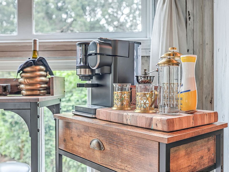 Welcome to The Raven Treehouse, nestled under the live ancient oaks in the serene surroundings of Wadmalaw Island, South Carolina. Part of the destination known as the Plumage Treehouses, this unique one-bedroom treehouse offers an enchanting escape, perfect for couples or solo travelers seeking tranquility and a touch of adventure. Guests enter into abundant natural light that pours through a wall of floor-to-ceiling antique farmhouse windows, featuring a beautiful crystal chandelier and fairy lights. A modern Queen bed, record player, bar-height dining area that can also be used as a desk, and a kitchenette with microwave, mini fridge, sink, and stove-top complete the cozy space. Finishing off the space is a working free-standing fireplace and coffee bar. The treehouse includes modern technology to keep you connected, such as Starlink Wi-Fi and TV, and a vintage-style record player, while thoughtful touches ensure your comfort and safety. Outside on the main level deck is an outdoor shower with roof, romantic swing bench, grill, pizza oven, and shaded dining table with a view of the marsh and trees draped with Spanish moss. A set of luxurious robes are provided throughout your stay and a starter kit of eco-friendly amenities is included for your convenience. Guests also have exclusive access to the expansive yard space and fire pit area in front of the treehouse. Available for photography, film, product fashion shoots, content creation, podcasts, interviews, movies, films, honeymoons, intimate corporate or wellness retreats, snowbird rentals, writing retreats, and those awaiting completion of area buildouts on their homes and more. This property has a 30-day minimum stay requirement. Inquire for more details. Located just a short drive from Charleston, you can easily explore the rich history, vibrant culture, and stunning beaches of the area. Wadmalaw Island is home to The Charleston Tea Garden, the only tea plantation in North America, Deep Water Vineyards, Bugby Plantation U-pick Farm, and more. Wadmalaw is also home to the house featured in the acclaimed movie, The Notebook. The Angel Oak Tree, Magnolia Plantation, Drayton Hall, Middleton Place, and Kiawah Island's Beachwalker Park are all a short, scenic drive away. Sailing, fishing, boat tours, biking, horseback riding, golf, tennis, and more are all nearby.