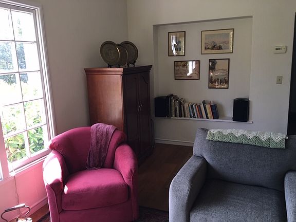 This charming studio apartment is part of a triplex located in one of the most desirable parts of Kensington, just north of the Berkeley border. It is a few minutes drive to the BART station and just two blocks from the bus stop to Campus or the City as well as neighborhood shopping. It features views straight out to San Francisco and the Golden Gate Bridge. The bedroom is light and features hard wood floors and built-in wooden bookcases. The unit has a kitchen that is separate from the main living space and two closets. Besides the bedroom area there is extra hallway space that is suitable for either extra storage or a small desk work area. There is a large backyard with fruit trees to either sit in or garden if that is your pleasure. The apartment comes with an off-street parking space and shared use of a washer/dryer. We are looking for a quiet, responsible, nonsmoking tenant who can really appreciate a very special place to live. One year lease renewable on a yearly basis. Tenant pays 10% of house utilities