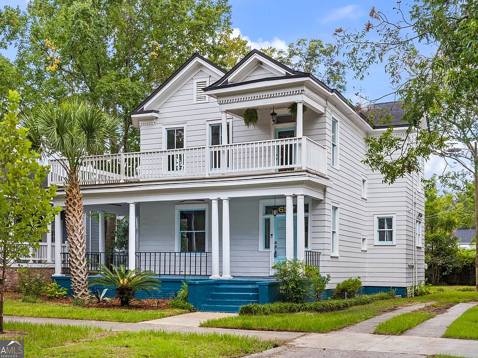 Experience the perfect marriage of historic Savannah charm and chic modern luxury. Expansive wrap-around porches on two levels welcome you, promising serene mornings with coffee and relaxed evenings with cocktails. Inside, soaring ceilings and rich hardwood floors flow through large, sun-drenched rooms. The gourmet kitchen is an entertainer's delight with granite countertops and stainless steel appliances. Retreat to the renovated bath, a true sanctuary boasting a romantic clawfoot tub and elegant double vanities. Your private paradise awaits outside on a rare double lot, dotted with fruit trees and offering endless space to unwind. With coveted off-street parking and a large storage shed, every convenience is met. This is more than a home; its an enchanting Southern lifestyle waiting to be claimed.