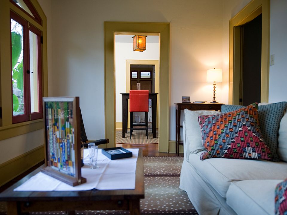 This charming apartment features bright, open living spaces, original leaded windows, a fully equipped kitchen, a private patio, a gas grill, fire pit, and a spacious backyard with views of the Louisiana State Capitol.