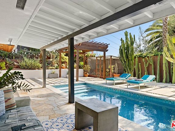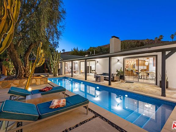 Located in Lakeridge Estates, a mid-century neighborhood near the Lake Hollywood Reservoir, 6570 Lakeridge Road is a 2,201 square foot ranch-style home that has been thoughtfully redone for modern living. Sunlight moves easily through an open floor plan that leads to multiple outdoor areas designed for entertaining. A new pool is ready for the summer heat and evenings spent under the stars. The large living and formal dining rooms share a two-sided fireplace, one functional and one decorative, and connect to a reimagined kitchen with a quartz-wrapped island, Viking double ovens, custom ventilation hood, and fixtures that recall the home's original design era. The primary bedroom opens directly to the pool deck. Its en-suite bathroom includes a soaking tub, step-in shower, dual sinks, and recently installed chrome fixtures. Two additional bedrooms share a second bathroom, with one room offering direct access. An oversized two-car garage with direct entry includes built-in storage and a raised laundry platform with side-by-side LG washer and dryer, installed two years ago. A $38,000 gated perimeter with driveway and pedestrian gates adds privacy and extra off-street parking. A five-camera security system and 24-hour live neighborhood patrol offer additional peace of mind. Set on a 12,027 square foot lot, the property is located near hiking trails, the Hollywood Bowl, studios, and markets including Whole Foods and Trader Joe's. This is Southern California living with clarity and intention.