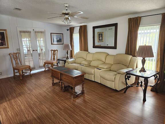 Welcome to this fabulous 2-bedroom / 2-bath home in the desirable Spanish Lakes Fairways 55+ Golf Course Community. Relax out back in your screened-in patio to take in stunning sunsets year-round! This home offers a spacious open floor plan with all the room you need to move around. The kitchen has plenty of cabinets and storage, granite countertops, a deep undermount sink, and a goose neck faucet. It's designed to be an eat-in kitchen with the more formal dining room adjacent, or you can add an island and set up stools as the kitchen space allows for it. No carpet, but instead has laminate flooring throughout for your comfort. Some newer items include a washer and dryer 2024, a newer A/C 2024, and an asphalt-shingled roof approximately 6 years old. This home offers a split bedroom floor plan with the guest bedroom towards the front of the house to allow more privacy for your guests, while the primary bedroom is towards the back of the house for your comfort and privacy, as well. The guest bedroom is spacious with a nice-sized walk-in closet. The primary bedroom has its own en-suite. In addition, this spacious retreat can fit a king-size bed and still has plenty of room to get around. Ample closet space meets all your wardrobe needs, as well. Just off the large living room, you can open the French doors that lead into the spacious bonus room/family room. From there, you can exit to step out into your super-sized screened-in patio, perfect for hosting barbeques or just relaxing and enjoying the views of the lake and taking in the sunsets! The park itself has many amenities for you to enjoy, such as free golf, 2 pools-one for guests and the other for residents, tennis courts, pickleball, many clubs to join, a card room, billiards, a gym, and so much more. The new owner's lot rent will be $1,081.00 and includes the use of all the amenities, lawn care, and trash. The water is $492.00 for the year. Beyond the park, explore all that beautiful Fort Pierce has to offer: world-class fishing expeditions, a vibrant coastal town, downtown architecture, stunning public beaches, nature and wildlife, aquariums and boat tours, marinas, gardens, trails, and golf courses, to name a few attractions. Perfect for those winter getaways or a full-time resident. Call today for a private tour of the amenities, the park, and the home that you can call yours! All listing information is deemed reliable but not guaranteed and should be independently verified through personal inspection by appropriate professionals. Our company does not and cannot guarantee or warrant the accuracy of this information or the condition of this property. Measurements are approximate. The buyer assumes full responsibility for obtaining all current rates of lot rent, fees, and pass-on costs. Additionally, the buyer is responsible for obtaining all rules, regulations, pet policies, etc., associated with the community, park, or home from the community/park manager. Our company is not responsible for quoting said fees or policies. Financing is available through 3rd party lenders. The sales price does not include tax, dealer fees, or administrative fees. Please contact the sales agent for additional information.