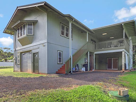 Long Days on Market due to some open building permits which are in the process of being finalized. Offer may be made subject to the permits being completed. The 5.97 acre property has some R2 zoning. There is a portion in the flood zone mainly around waterway. The property is a beautiful oasis that contains streams, many open spaces, and wonderful views. The home has been converted into two, independent rentals. The home can easily be made a single-family residence again by opening up the stairwell between the two floors and adding a guardrail around the top opening. The house was extensively renovated around 2017 when the conversion to two rentals occurred. The flooring was upgraded to quality ceramic tile, repainted, kitchen cabinetry updated, and new appliances bought. The roof, recently re-shingled, exterior was repainted, and the original house on the property, removed. The views around the property are exceptional and provide privacy. There are many mature trees on the property, including several fruit-bearing trees. The main floor comprises 2/BD/1BA, a large storage area, an enclosed laundry area, kitchen, and living-dining room area. The unit has direct access to a 570 sq. ft. garage and a large lanai. The second floor has a large master bedroom with ensuite bath and walk-in closet, another bedroom, hallway bath and great room. There are two lanai - one on the front and one in the rear. Both levels have many windows that allow lots of natural light to illuminate the entire space. There are three ceiling fans with lights in both up and downstairs living areas and one in each bedroom.