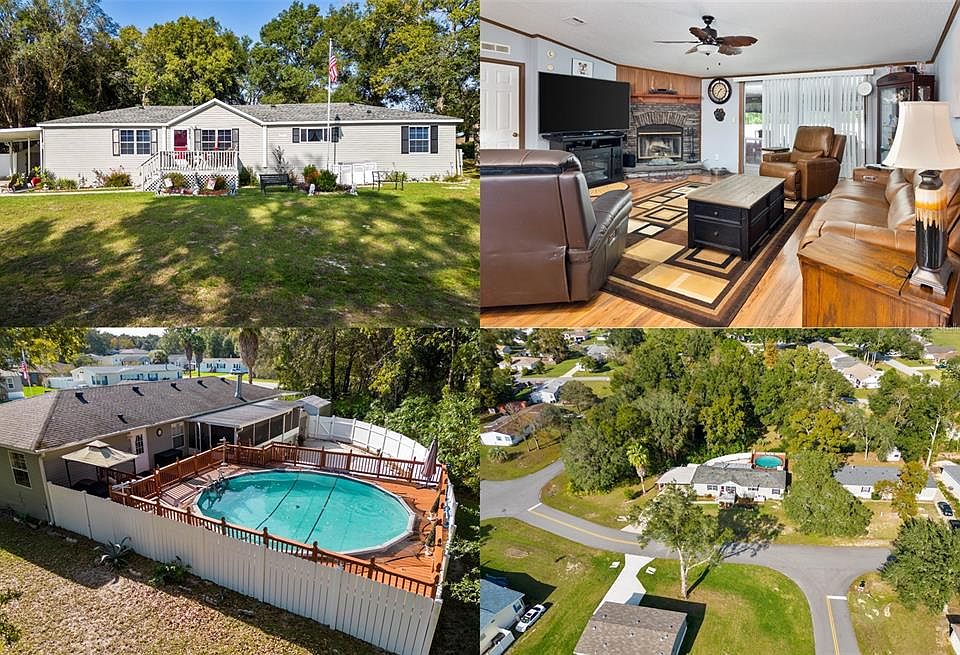 Immaculate manufactured home! LOCATION, LOCATION, LOCATION in SW Ocala! Convenient to shopping, restaurants, medical, and other supportive services. There is so much to love about this home. The backyard is fenced. This spacious home includes a beautiful wood burning fireplace in your living room, 4 bedrooms, 2 bathrooms with an office/Den room that can also be used as a 5th bedroom, a beautiful kitchen with granite countertops, and stainless steel appliances. The perfect home to entertain!! Wait until you see the beautiful pool with wraparound deck, grill area, thinking about adding a hot tub? We got you covered, this home already has 220V hookup for your hot tub, spacious front porch & screened back porch. Need storage? No problem, this home includes 3 sheds. New drain field and septic done in 2023. HUD certificated with hurricane straps, the roof was replaced in 2017. Seller is offering $4,000 toward buyers closing costs or to buy down their interest rate. Schedule your private showing today!